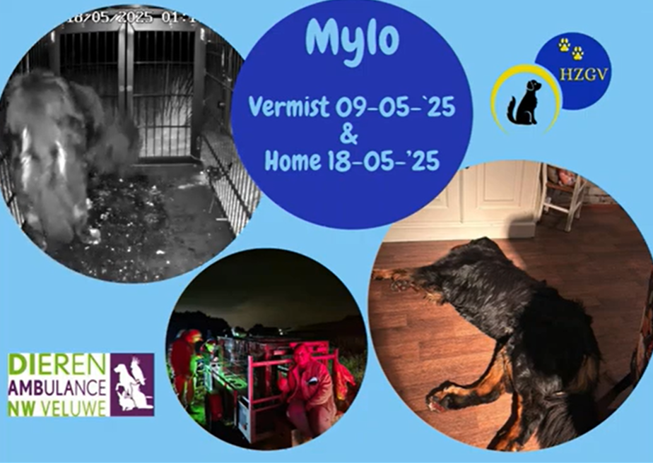 Vrijdag 9 mei ging Mylo voor een wen dag naar het pension in Putten aan de Veldhoefweg. Deze wen dag was als voorbereiding voor de vakantie van Freek en Hetty. In de vroege ochtend werd Mylo gebracht maar 1,5 uur na het wegbrengen kwam daar het telefoontje dat Mylo over de omheining was gesprongen en niet meer in beeld. De familie snelde zich naar de locatie maar hoe hard ze ook zijn naam riepen Mylo was verdwenen in het bos en natuurgebied rondom het pension.